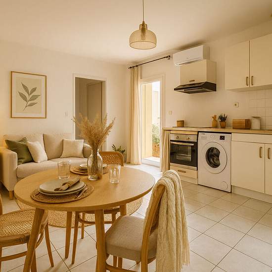 Aix les milles centre village situé dans un petit immeuble en plein centre du village, appartement type 3 de 61.41 m² en 1er étage, comprenant un hall, un séjour cuisine ouverte, 2 chambres, une salle d'eau, wc. L'appartement dispose d'une grande terrasse et de la climatisation dans le séjour. Loyer : 965 charges : 30 honoraires : 798 dépôt de garantie : 965e dpe e 268 ges c14 estimation cout annuel en énergie 739e.