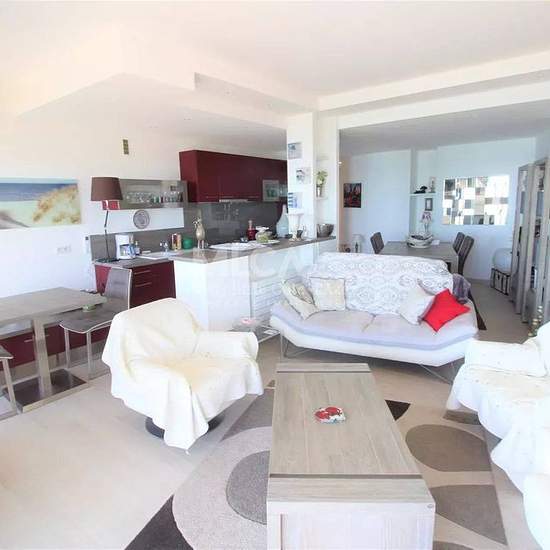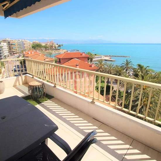 Vue mer panoramique pour cet appartement entièrement rénové, commerces et plages au pied de l'immeuble Séjour avec cuisine américaine, 1 chambre avec salle de bain et wc en suite, une chambre avec salle de douche, wc indépendant, deux terrasses. Appartement entièrement climatisé Couchages pour 4 personnes Prix haute saison: 1 875 € par semaine