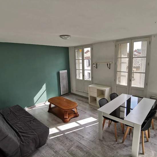 AUCH centre ville Appartement meublé Type 3 Environ 52m² habitables Pièce à vivre avec cuisine équipée Deux chambres avec placards Salle d'eau avec machine à laver le linge Wc indépendant Chauffage électrique - Double vitrage Très lumineux! Possibilité de louer un garage en plus.
