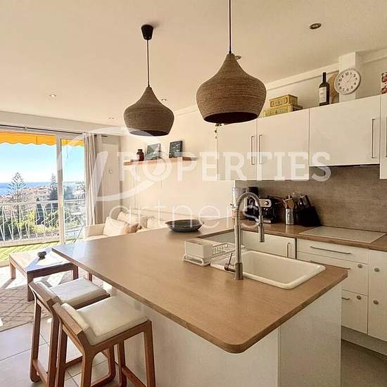 Near the city center, charming three-room apartment in perfect condition. Located on the fourth floor, it enjoys a beautiful panoramic view of the sea and is composed as follows: entrance hall with closet, a double bedroom with balcony, a children's bedroom (single bed convertible to double) with balcony, a guest WC, a shower room, a living area with a fully equipped open kitchen that opens onto a small terrace. A large garage completes the property. Long-term furnished rental (12 months). Rent, charges included: €3,000/month. Charges includ...