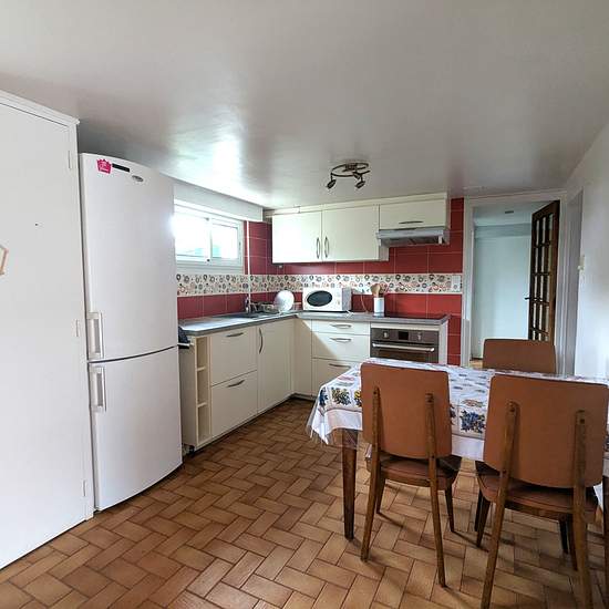 Le logement est situé au rez-de-jardin d'une maison divisée en deux unités. L'entrée donne sur une pièce de vie composée d'un coin salon et d'une cuisine ouverte. L'espace cuisine est aménagé avec une plaque de cuisson, une hotte, un four et un réfrigérateur. Deux chambres sont présentes. La première chambre est équipée d'un placard intégré. La seconde, plus petite, comprend également un petit placard. Un dégagement assure la distribution de la salle d'eau équipée d'une douche à l'italienne, d'un meuble vasque et d'un WC. L'installation de c...