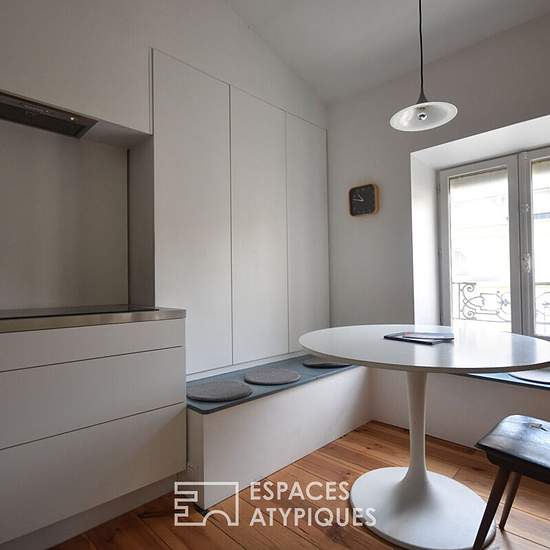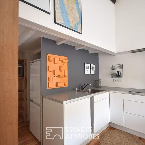 Situé dans le très charmant quartier de Ste Croix, cet appartement duplex dispose de 3 pièces sur 52m2 au sol. Au second et dernier étage d'un immeuble en pierre, l'appartement a été entièrement repensé par Architecte. Hyper fonctionnel et moderne, le charme d'origine se mêle à la rénovation contemporaine avec goût et subtilité. L'entrée se fait par une spacieuse pièce de vie avec de belles hauteurs sous plafond. Séparées par une étagère sur mesure, la partie salon et la partie cuisine se font face. Ce premier niveau est complété par une jol...