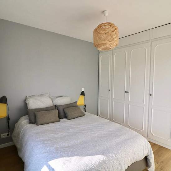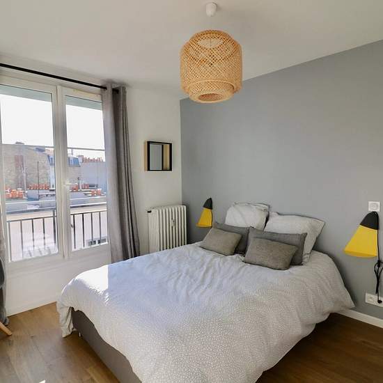 Loué : Au 5e étage avec ascenseur d'un bel immeuble ancien, superbe appartement de 53 m2 totalement refait à neuf, meublé et équipé avec soin. Il bénéficie d'un plan parfaitement optimisé avec une entrée, un séjour, une cuisine avec tout l'électroménager intégré, un espace nuit avec 1 dégagement + placard, une chambre avec 1 lit double + placard intégré, une autre chambre avec 1 lit simple modulable en double + rangements, une salle de douche avec lave linge et toilettes séparés. Fibre optique Orange, petit électroménager, vaisselles, couver...