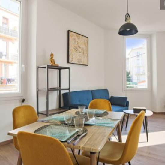 Situé à 10 min à pied de la plage, proche de la gare et du centre-ville, cet appartement est parfait si vous souhaitez vous détendre et profiter du soleil du Sud. Ce beau T3 de 70 m² est situé au 2ème étage sans ascenseur dans une rue calme et piétonne et est composé de : - un salon lumineux et agréable avec canapé-lit, - une chambre avec lit double, - un deuxième salon avec canapé-lit, - une cuisine ouverte équipée (machine à café, grille-pain, combiné four/micro-ondes, plaques de cuisson, frigo, lave-vaisselle), - une salle de bain avec ba...
