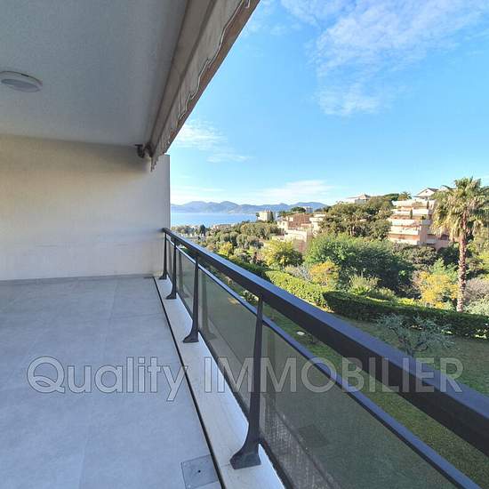 CANNES - VUE MER située dans la partie basse de la CROIX DES GARDES accès facile / au Sein d'une résidence de standing sécurisée à 8 minutes de Cannes Centre. Très beau 3 P ( 86 m² + Véranda de 15 m² réellement habitable soit 101 m²). Environnement verdoyant / et calme absolu, jardins fleuris et grande piscine. Immense terrasse de plus de 26 m² pour vos repas et accueillir vos amis ou la famille. Hall d'entrée, salon, (exposition Ouest au soleil couchant), salle à manger, cuisine semi-équipée avec Plaques et hotte, deux chambres,( Expostitio...