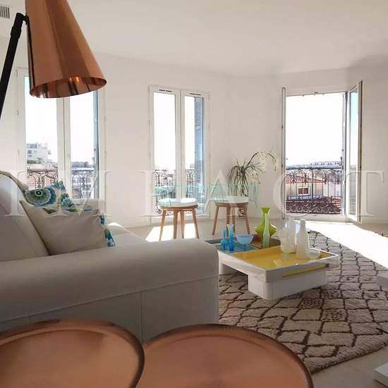 Cannes centre, proche Gambetta, à 8min à pied du Palais des Festivals. Bel appartement rénové et très lumineux d’env. 64,50m2 ouvrant sur balcon circulaire sud/ouest de 20 m de long x 1m de large, vue dégagée sur les toits, aperçu mer et Suquet. Au 4ème et dernier étage d’un immeuble bourgeois avec ascenseur. Parties communes rénovées. Description: Entrée, toilettes invités Double séjour ouvrant sur balcon circulaire sud/ouest. Vue dégagée sur les toits, aperçu mer et Suquet. Espaces repas 6 personnes et espace salon avec TV écran plat Cuisi...