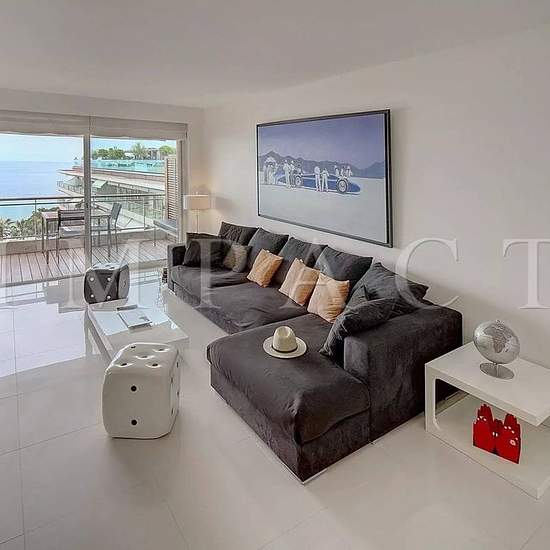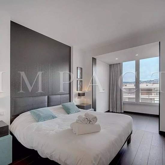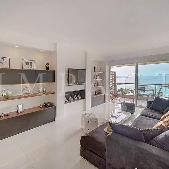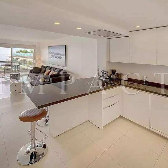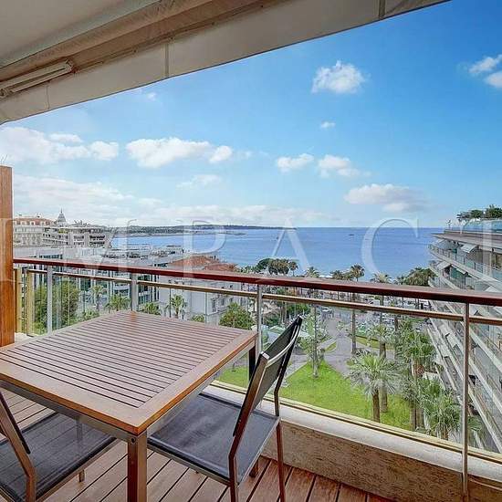 Dans résidence de standing avec gardien 24/7. Appartement 2 chambres d'environ 70m² entièrement rénové, avec terrasse sud d'environ 8m², vue parc et mer. Descriptif : Grande entrée, dressing et placards Toilettes invités Salon sud ouvrant sur terrasse vue mer, espace sofa TV écran plat Terrasse couverte vue parc et Croisette, table 4personnes Cuisine design ouverte sur séjour, bar, réfrigérateur-congélateur, ice-maker, four / micro-onde, plaque électrique, machine expresso, lave-vaisselle, lave-linge + sèche-linge Chambre double (n°1) nord, ...