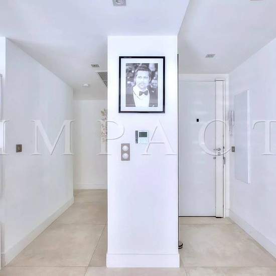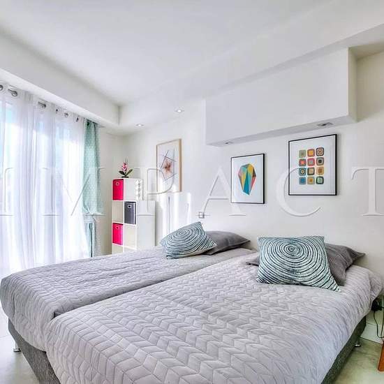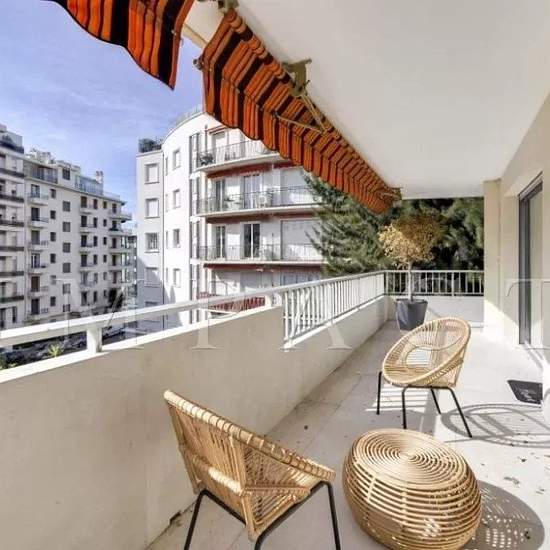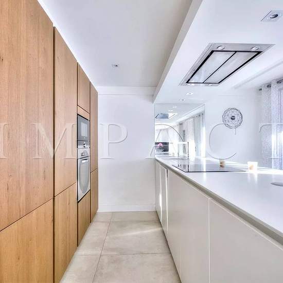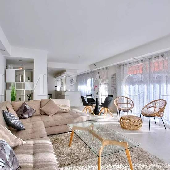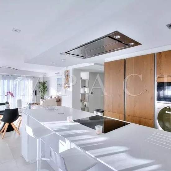 Magnifique appartement entièrement rénové d'environ 86m² + terrasse d’environ 32m². Exposé Sud-Ouest, à 50m de la Croisette, derrière l’Hôtel Marriott Terrasse aménagée offrant vue dégagée sur la ville de Cannes Description : Entrée, toilettes invités Séjour spacieux d'environ 43m², équipé d'un canapé pour 4-5 personnes, télévision écran plat, s’ouvrant sur la terrasse. Coin salle à manger avec table à manger et chaises pour 4 personnes Grande cuisine Américaine ouverte entièrement équipée avec four, micro-ondes, lave-vaisselle, réfrigérateu...