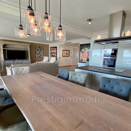 CANNES bas petit Juas très bel appartement de standing 7em étage 3P 100m² vue mer panoramique sur la baie de Cannes et les iles de Lérins. L'appartement comprend 1 entrée avec buanderie, 1 vaste séjour lumineux de 53m² avec cuisine américaine équipée, terrasse de 25m², une chambre en suite avec salle de bain + douche une terrasse, 2éme chambre avec bureau et salle de douche, un wc indépendant. 1 place de parking , 1 cave. Centre ville, plages, commerces, bus et gare Proche à pied. Loyer 3900€ cc Caution 7100€ Honoraire 3900€ (bail non réside...