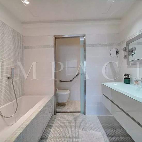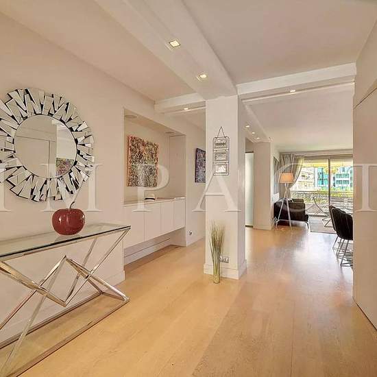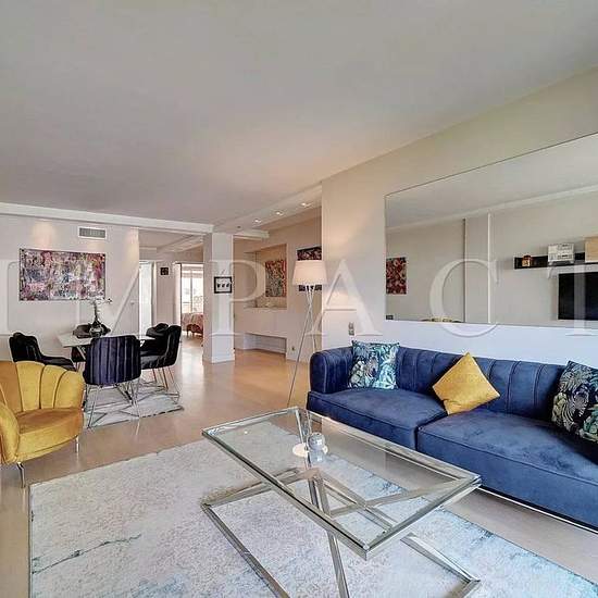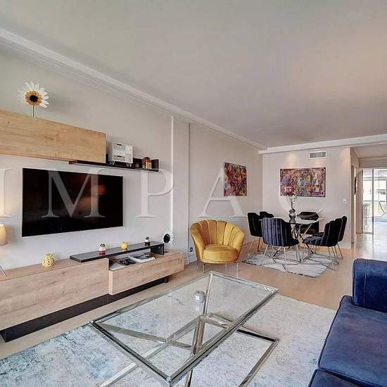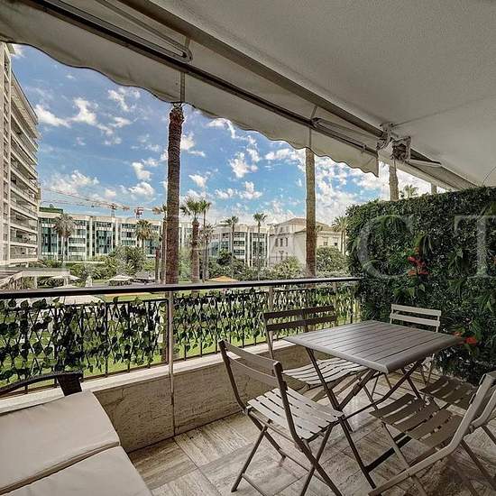Centre Cannes Croisette, résidence de grand standing donnant sur un parc, vigiles et réception 24H/24H. Appartement 2 chambres, environ 100m² entièrement rénové, terrasse sud est 7m², vue parc et mer. Descriptif : Grande entrée Double salon avec un espace canapé télévision écran plat, une table repas 6 personnes, ouvrant sur terrasse Est vue parc ce mer. Terrasse couverte vue parc et Croisette, table pour 4 personnes. 1 grande cuisine indépendante entièrement équipée, réfrigérateur, congélateur, four, micro-onde, plaque électrique, machine N...