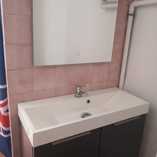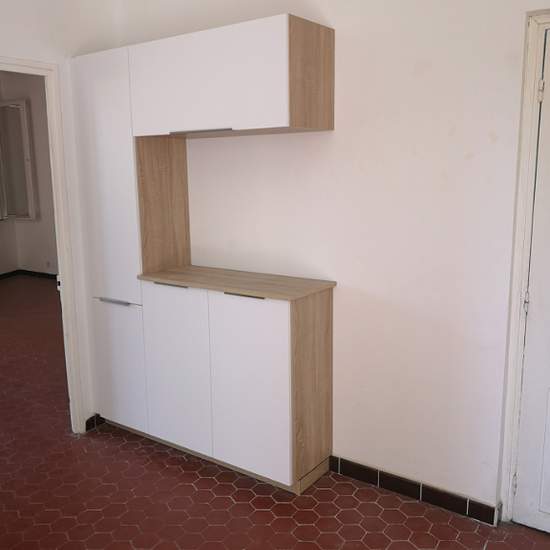 Appartement lumineux au premier étage, composé de deux chambres, salon avec placards, cuisine équipée avec un balconnet, salle d'eau avec toilettes.