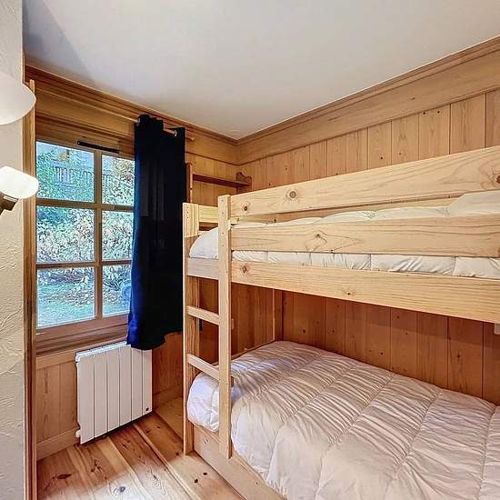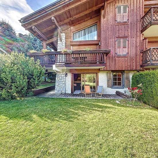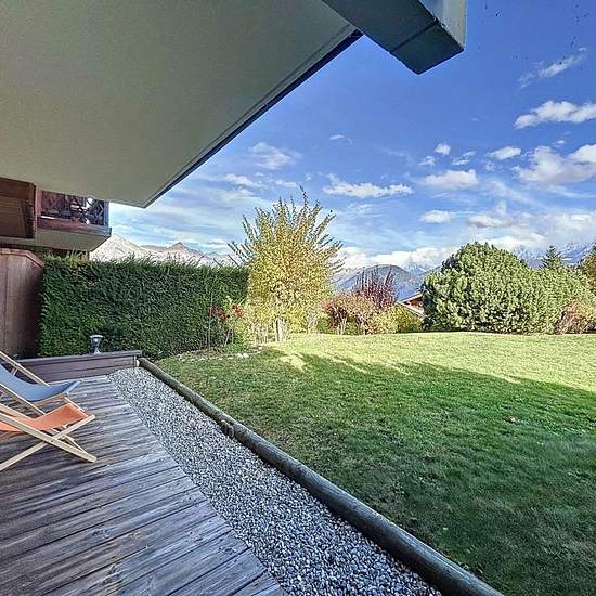 Au Rez-de-jardin d'une petite résidence, appartement de type 2 pièces + cabine d’une surface d’environ 45 m, il se compose : d’une entrée, un WC séparé, une salle de bain avec lave-linge, une chambre enfant avec deux lits superposés (2x90) placard, une chambre avec un lit double (160) avec placard et tv, une espace séjour coin repas salon, une cuisine ouverte équipée (four, lave-vaisselle, cafetière, grille-pain, frigo, bouilloire) le tout donnant sur une belle terrasse d’angle avec jardin face au Mont Blanc. Un casier à ski, une place de pa...