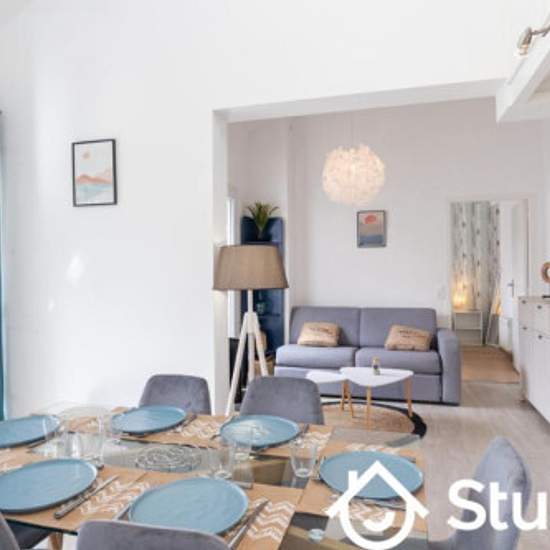 Disponible exclusivement en bail mobilité (1 à 10 mois). Idéal pour stagiaires, salariés en déplacement professionnel, alternants, étudiants, ou missions temporaires dans la région de Quimper / Pont-l'Abbé / Bénodet. Situé à Combrit, à moins d'1 km de la plage et proche de toutes commodités, cet appartement meublé lumineux, exposé plein sud, offre un cadre de vie calme et agréable. Il se trouve au 1er étage d'une maison et peut accueillir jusqu'à 6 personnes. --- Description du logement Pièce de vie * Grand séjour, lumineux * Canapé-lit doub...