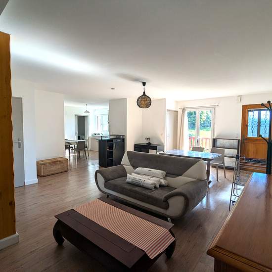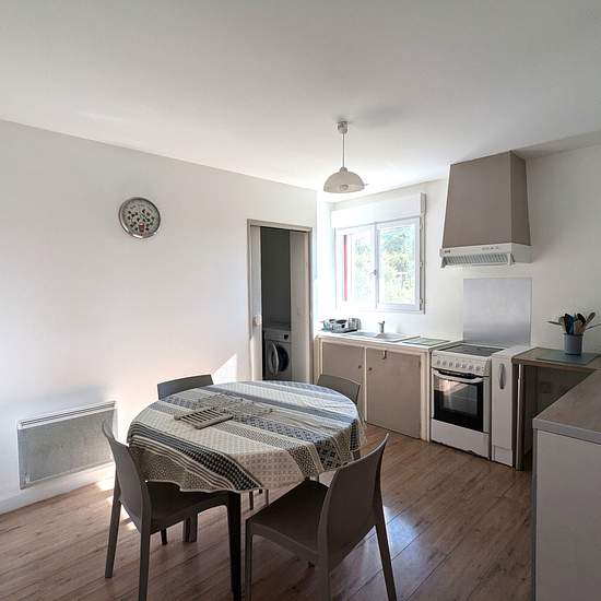 Cet appartement T3 se situe au premier étage d'une maison avec un petit jardin à l'avant. Cet appartement meublé dispose d'une pièce de vie de 33m2 intégrant un séjour avec cuisine ouverte équipée d'une gazinière électrique, d'une hotte, d'un réfrigérateur, d'un lave-vaisselle, d'un lave-linge et d'un micro-onde. Un débarras offre un espace de rangementsupplémentaire. Côté nuit, un dégagement mène à une salle d'eau équipée d'une douche et d'une VMC, un WC séparé et deux chambres avec placards. Un balcon accessible depuis le séjour offre un e...