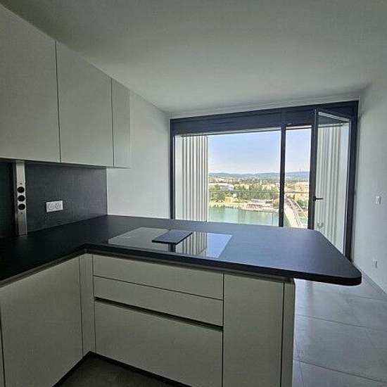 Huningue, near Parc des Eaux Vives, next to the footbridge / Rhine / Weil am Rhein, Basel / Novartis: High-end apartment approx. 70 m² / large living-dining room approx. 30 m² with open-plan kitchen / 2 bedrooms, 1 bathroom, 1 toilet. Avant-garde location, at the foot of the footbridge, a short walk from Germany and Basel! Beautiful balcony approx. 6 m², southeast-facing, with an unobstructed view of Germany, the Rhine and the Black Forest. Unique location, ambiance and atmosphere! Gas-fired underfloor heating. One-car garage (possibility to...