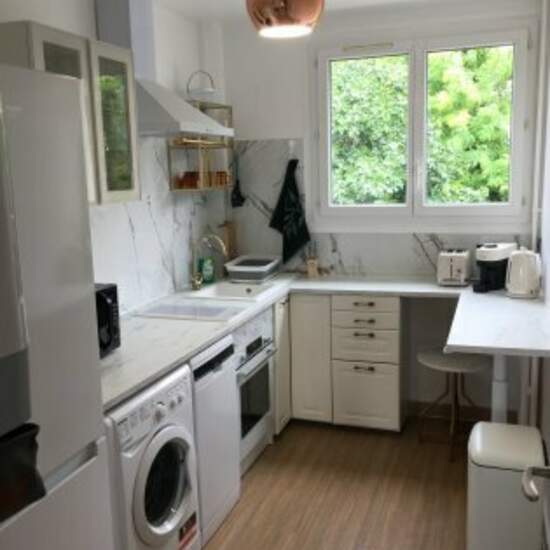 Newly refurbished flat ideally located 50 metres from L'hay Les roses town centre and Parc de la Roseraie, in a family residence with parking space. This 3-room apartment has been refurbished and furnished with quality materials, and can accommodate up to 6 people. The 2 bedrooms are independent, one with a double bed and the other with two single beds, each in its own style. The cosy, industrial-style living room doubles as a dining room and has a sofa bed that can accommodate two extra people. There is a 55-inch Hitachi flat-screen TV with...