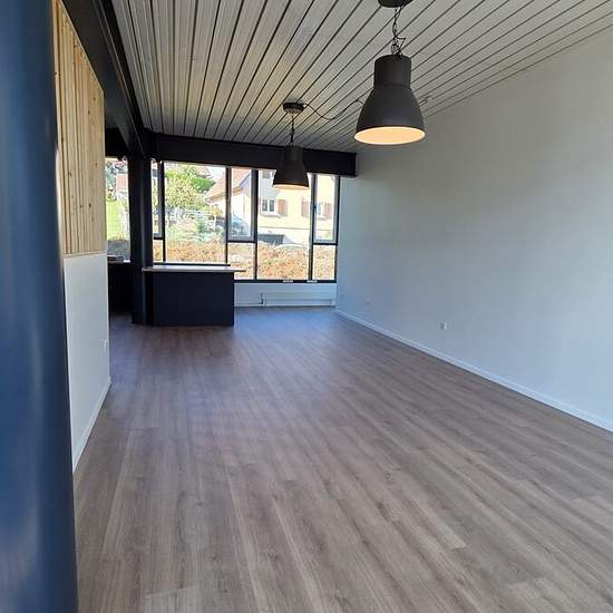 A LABAROCHE, magnifique F3 de 110m2 m² situé au premier étage: Très lumineux, entièrement rénové. Une entrée donnant sur cuisine équipée ( îlot central, four, plaque de cuisson, lave-vaisselle ) , deux chambres, un grand salon , un espace pouvant faire office de bureau, une salle d'eau avec WC. Une place de parking privative , un local faisant office de cave. Chauffage collectif au fioul. Volets électriques. Loyer hors charges : 700€/mois. Provisions de Charges en sus: 280 €/mois comprenant l'eau froide, l'eau chaude, chauffage et électricit...