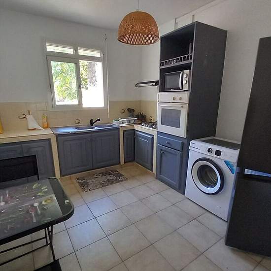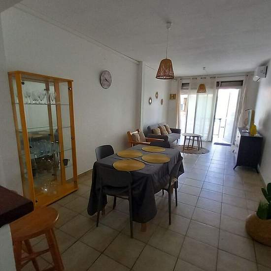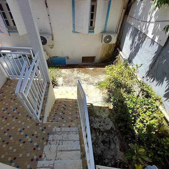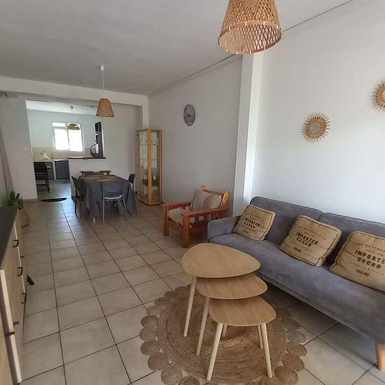 Appartement de type T3 meublé - Bourg GOSIER. Un appartement de type T3 meublé composé d'un grand séjour, une cuisine aménagée et équipée ouverte, deux chambres climatisées (dont une sans fenêtres extérieures), un dégagement avec lave-mains, salle de bain et wc indépendant. Terrasses avant (coté rue) et court arrière avec un coin jardinet, une citerne tampon donc pas de coupures d'eau. Electricité et internet à la charge des locataires. Eau comprise. Disponible au 07 juillet 2025.