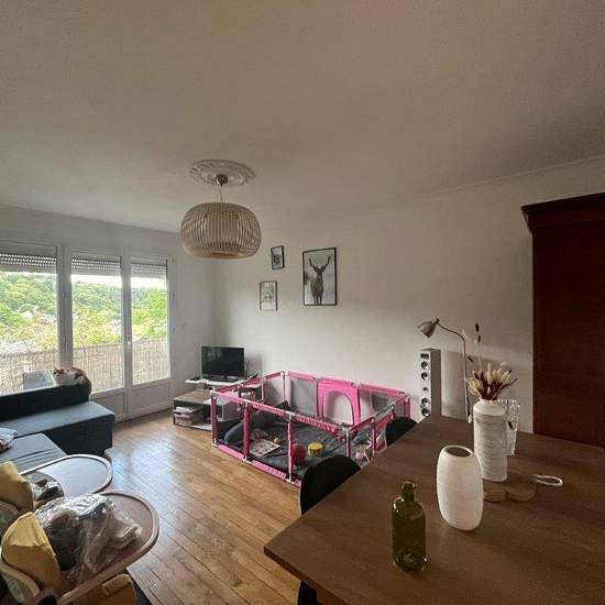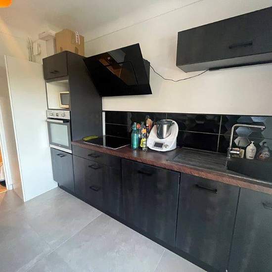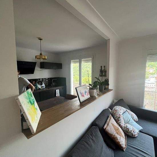 Une entrée avec Placard, une cuisine américaine avec des éléments hauts et bas, une hotte, un four, des plaques à induction, un espace avec table fixe et rangement accolé au mur. Un séjour env. 17.60 m², un balcon. Deux chambres dont une parentale avec un placard, une salle d'eau avec un meuble vasque, un sèche-serviette, une cabine douche et un espace pour un lave linge en 40cm. Un grand garage profond alimenté en eau et électricité. Possibilité de stationner un véhicule devant le garage. Un cellier au 1er étage avec électricité. Chauffage ...