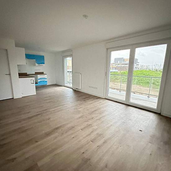 Annonce 4039- Contacter IMMO DE FRANCE Charlotte Masse au O7.64.86.84.14- Lesquin, rue Simone de Beauvoir, A louer appartement type 3 neuf de 65m² offrant un hall d'entrée avec placard, un séjour avec cuisine ouverte équipée, deux chambres, une salle de bains, un cellier, WC séparés- Loué avec parking sous sol -** LOI PINEL ** Disponible le 29 Janvier
