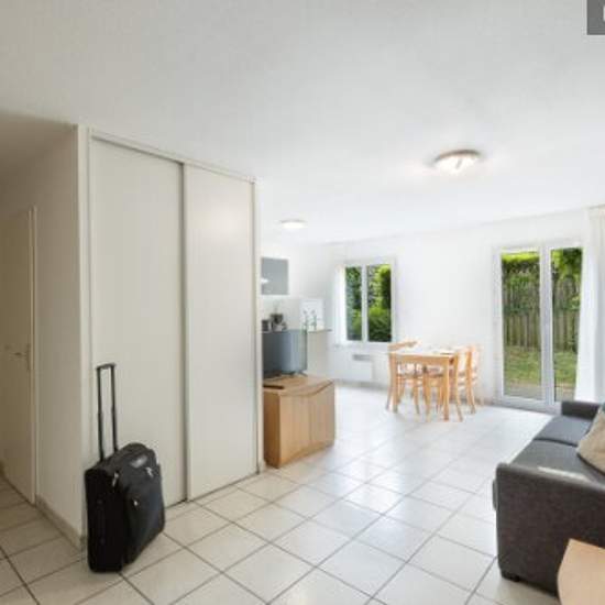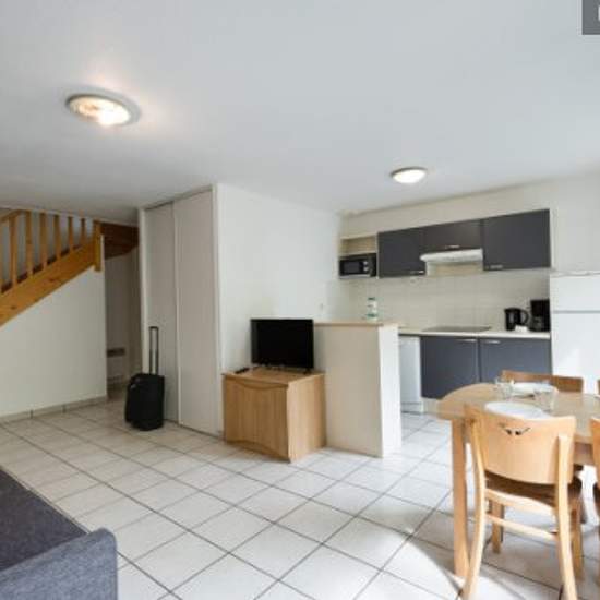 Appartement en duplex de 65m² au sein de la résidence Garden & City Lyon Lissieu, salon avec canapé convertible, coin cuisine équipée avec réfrigérateur, plaques de cuisson, lave-vaisselle, micro-ondes et cafetière, salle de bain avec baignoire , 2 toilettes séparés, 1 chambre avec grand lit, 1 chambre avec 2 lits simples séparés, terrasse au rez de chaussée. Plusieurs placards muraux dans le logement. Tarif non valable en juillet et en août