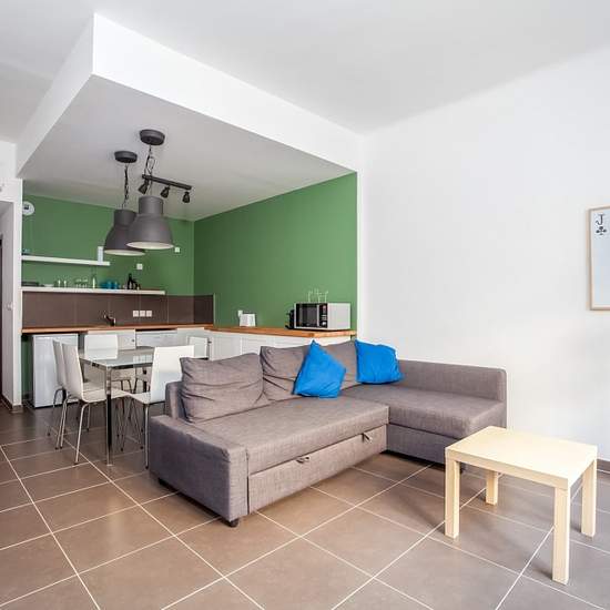 Appartement entièrement refait à neuf d'environ 60m2 composé de 2 chambres doubles, un grand salon avec cuisine US, un coin Salle à Manger, une salle d'eau avec WC. Orientation ESt/Ouest Immeuble pourvu d'un ascenseur. Equipements : Chauffage / Climatisation, TV, Frigo, lave linge, lave vaisselle, micro-onde grill, plaques de cuisson, machine à café Nespresso, grille pain,Internet Wifi Loyer: 1198 EUR dont 100 euros de charge sur provision