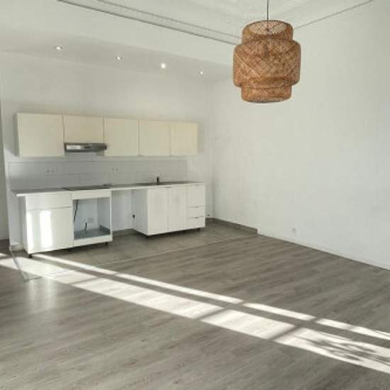 Situé sur la rue de la République, T3 composé d'une entrée, d'une pièce à vivre avec cuisine ouverte aménagée (mobilier, plaque, hotte), de deux chambres avec placard, d'une salle d'eau avec WC.