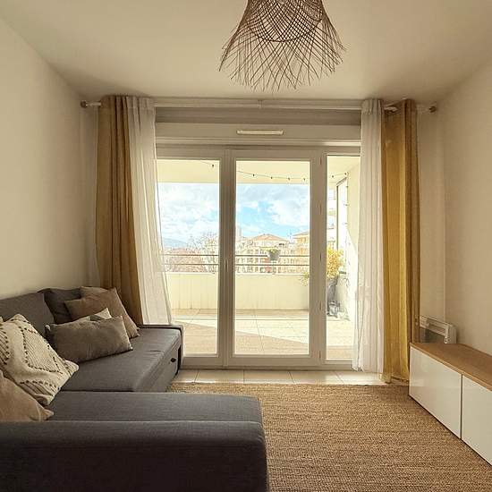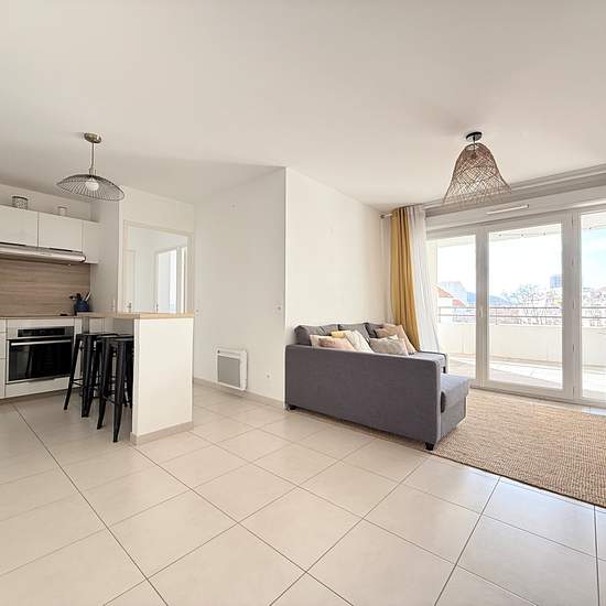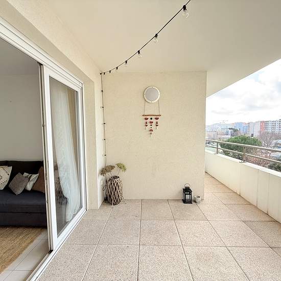 Marseille 8ème - Parc du 26ème Centenaire / Bd Maillane. Dans une résidence récente et bien entretenue, nous louons un appartement de type 3 meublé de 59 m2 situé en 3ème étage avec terrasse expo Sud-ouest et garage en sous-sol. Très lumineux, l'appartement comprend un séjour avec penderie à l'entrée et une cuisine ouverte entièrement équipée avec réfrigérateur, four, plaques, hotte et lave-vaisselle. Le séjour donne accès à une belle terrasse de 12 m2 exposée sud-ouest. Un couloir dessert deux chambres avec placards, un WC séparé et une sal...