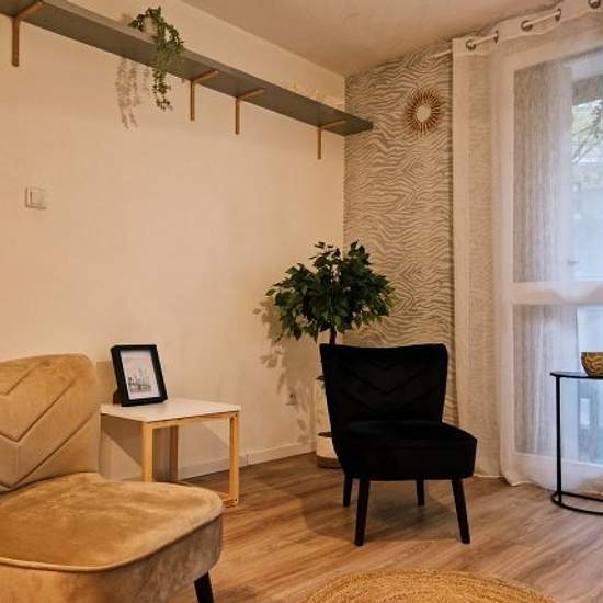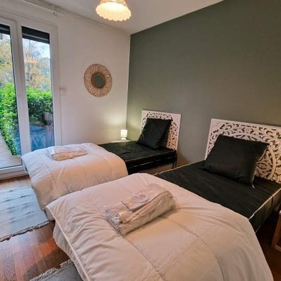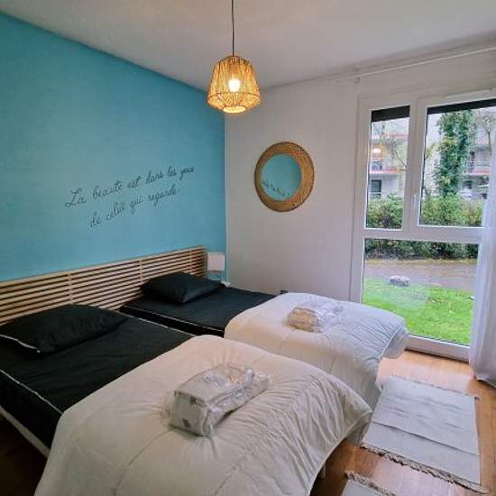 Spacious 3 room apartment located in the Résidence du Parc, Chemin de la Violette in Moirans. --------------------------------------------------------------------------------------------------------------------------- Your accommodation : This ground floor flat consists of : - an entrance hall with storage space - a separate kitchen, fully equipped: dishwasher, washing machine, Nespresso coffee machine, toaster, kettle, fridge/freezer etc. - a living room equipped with lounge/dining room - a large terrace - an office area, Your sleeping spac...