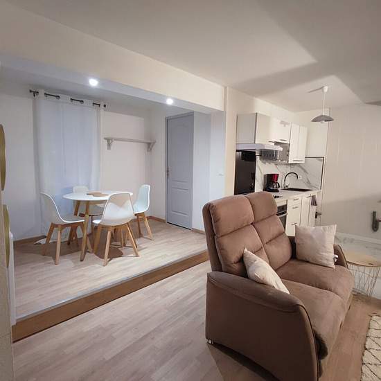 Coeur de ville à deux pas des rues piétonnes et de la mairie, bel appartement T3 meublé en rez-de-chaussée et souplex, dans un petit immeuble de 2 étages et de 3 logements. Cet appartement vient d'être rénové et joliment meublé. Le rez-de-chaussée de 48 m² habitable est composé, d'une entrée, WC indépendant, une pièce de vie en 3 volumes (repas, salon, cuisine Américaine) de 31 m², une chambre de 11 m² et son dressing attenant, une salle d'eau avec douche Italienne et lavabo. En souplex une cave voutée chauffée de 38 m² utile, avec un coin s...