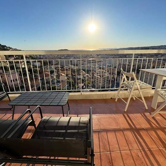 Magnificent furnished, south-facing through apartment opening onto a large terrace with an incredible panoramic view of the city and the sea. A cellar and a garage are included in the rental. Show the phone number