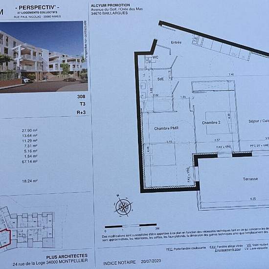 Résidence récente Perspectiv' 72 Rue Paul Nicolas à Nîmes Magnifique T3 au 3ème étage de 67.14m² avec terrasse de 18.24m², exposition Sud. L'appartement se compose d'un séjour - cuisine équipée de 27.90m² , de deux chambres de 13.64m² et 11.29m², d'une salle de bain et d'un WC séparé. Un parking sous-sol inclus. A proximité de l'avenue Kennedy et des arrêts de Tram Bus ligne T2 « les Amandiers » et « Kennedy ». Loyer de 853,41 euros charges comprises (dont 90 euros de charges). Les honoraires sont de 420 euros (dont 120 euros pour l'état des...