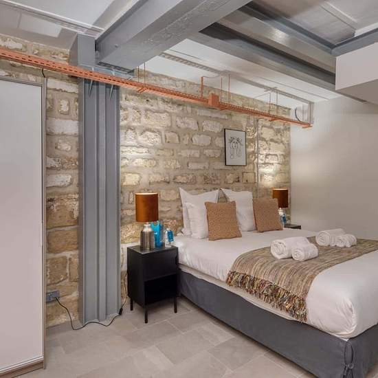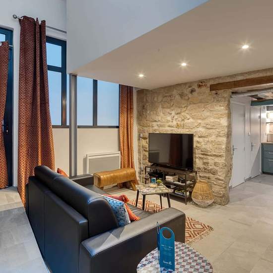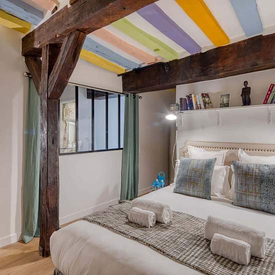[EN] Explore Paris like a true local in the spacious two-bedroom Gravilliers Sweett apartment in Paris’ iconic Marais neighbourhood. Design enthusiasts will relish the striking contrast between the modern exposed pipes and the old wooden beams in this spacious two-story apartment that exudes a quintessential Parisian ambience. The original stone walls serve as a stunning backdrop for the bold, vibrant colours that adorn the space. If you love to shop for fresh Parisian produce and prepare your own meals, the fully-equipped kitchen has everyt...