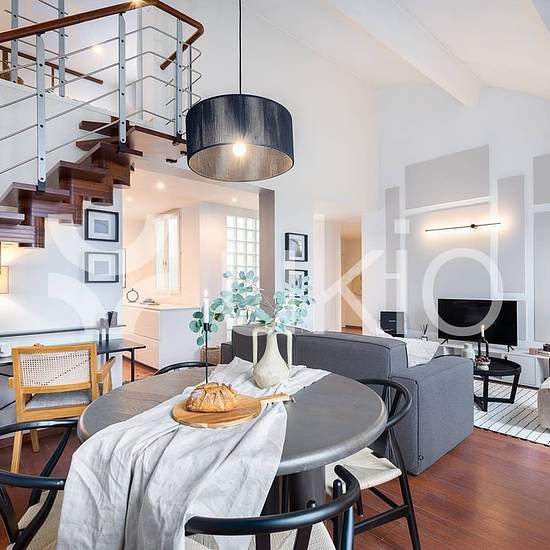 Splendide appartement duplex rénové et meublé situé Avenue des Gobelins, dans le quartier de Jardin des Plantes, dans le 5e Arrondissement. Il est situé au 7ème étage avec ascenseur, à proximité des stations Les Gobelins, Campo-Formio et Place d’Italie. Dans les environs, on peut trouver des attractions telles que le Jardin des Plantes, l’Ecole du Val de Grâce et la Galerie des Gobelins. Il est composé de deux chambres à coucher avec un lit double, un séjour, une cuisine, deux salles de bains et trois balcons. Les lits sont équipés d'une lit...