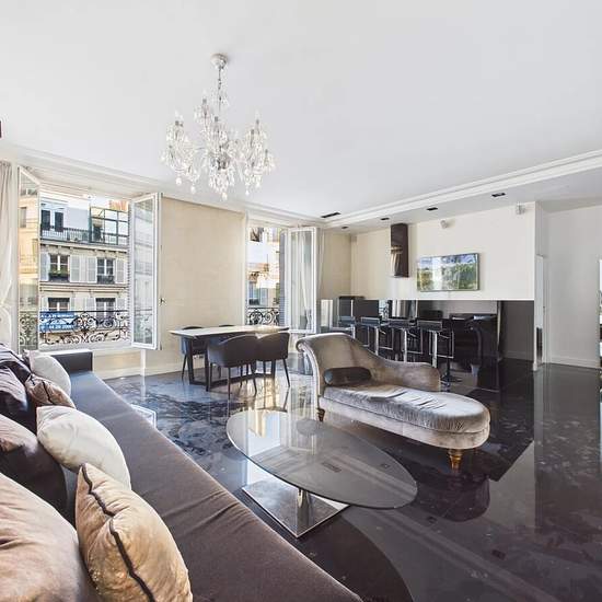 Au cœur de la très recherchée rue du Faubourg Saint-Honoré, à proximité immédiate de l’Élysée, situé au 3ᵉ étage avec ascenseur d’un superbe immeuble en pierre de taille avec gardienne, appartement meublé de 100 m². Il se compose d’une entrée, d’un vaste séjour avec cuisine américaine entièrement équipée, d’une suite parentale avec salle de bains (baignoire balnéo, douche hammam et WC), d’une seconde chambre avec salle d’eau, ainsi que de WC séparés. Climatisation, prestations haut de gamme, immeuble sécurisé avec gardienne. Idéal pied-à-ter...