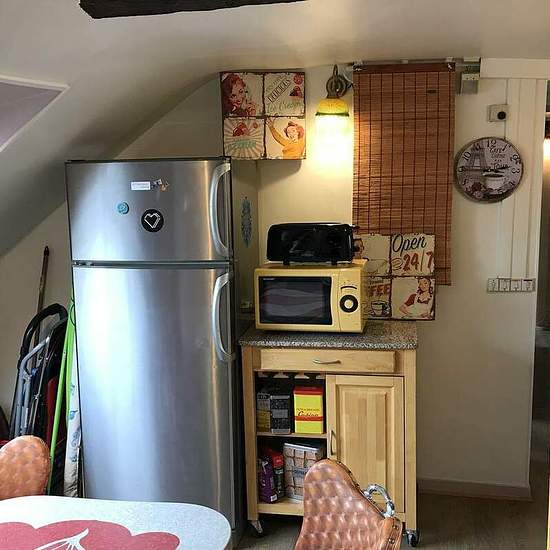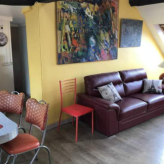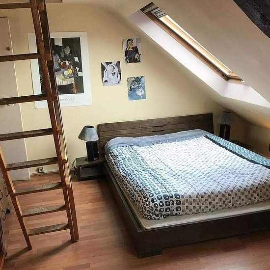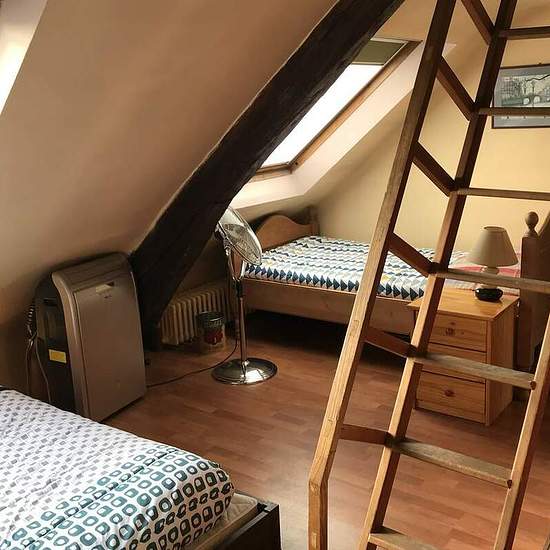 The apartment is located between Montmartre and the Opera and it is 10 minutes of walk from Grands Boulevards. It is a 3-room apartment of 95 m that sleeps 5 persons. It is located on the 5th French floor. The 19th century building is equipped with an elevator, an entrance code and an interphone. There is a living room, an American kitchen, 3 bedrooms and a bathroom. The apartment is very light and functional with a very nice view. The living room A big charming room with visible beams (typical element in the buildings of the 19th century...