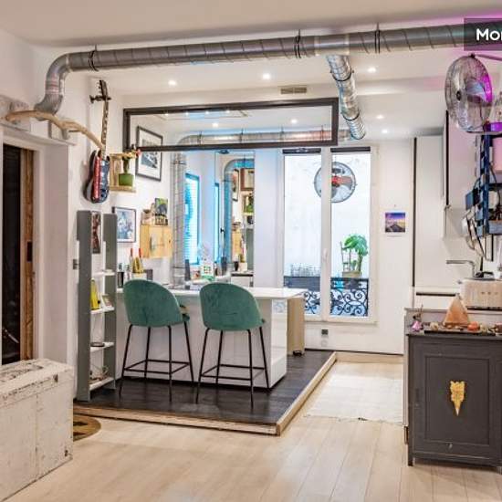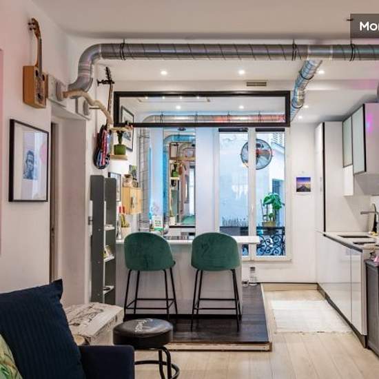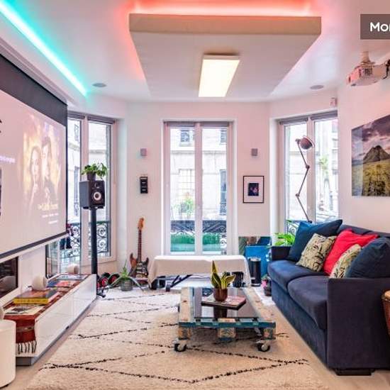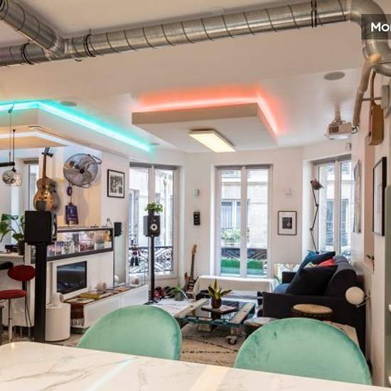 In the heart of Paris, this atypical and artistic 66 m2 flat offers a silent bedroom in a recording studio with a king-size bed and a large TV, opposite a room with a desk, a living room with a queen-size memory foam sofa bed, a fully-equipped open-plan kitchen, and a bathroom with Jacuzzi. In terms of equipment, you have a very fast wifi connection, a video projector and a large screen in the living room for watching films, as well as speakers and a mixer for listening to music. This is a rare flat in Paris, ideal for mobility trips, profes...