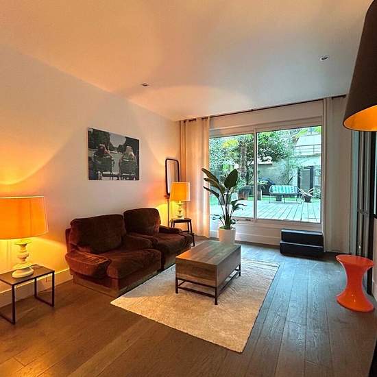 Appartement meublé avec jardin situé rue Henri Heine à proximité du métro Jasmin et du Bois de Boulogne. Un appartement de plain-pied très calme donnant sur cour avec un grand jardin de 103 m² et une resserre pour stockage de 23 m² au fond du jardin. Appartement comprenant un séjour, deux chambres, un grand dressing, une cuisine américaine entièrement équipée (évier, rangements, plaques chauffantes, hotte, réfrigérateur, micro-onde, lave-vaisselle, cave à vin), une salle de bains avec lave-linge, un WC indépendant et une resserre. Chauffage ...