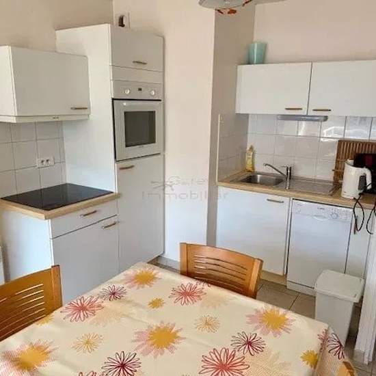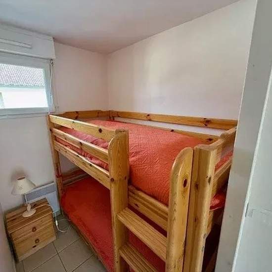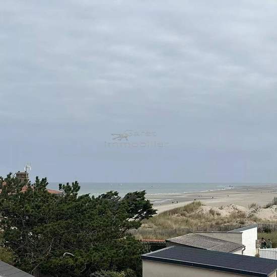 Appartement à Quend-plage, comprenant une entrée, un séjour ( avec canapé lit) avec cuisine donnant accès sur une terrasse ( vue latérale mer), un coin cabine avec un lit superposé, une salle de douche, un toilette et à l'étage, une chambre avec un lit double et une salle de bain.