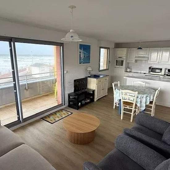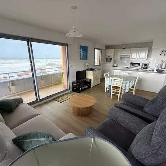 Appartement face mer avec terrasse SUD-OUEST, comprenant : une entrée, un séjour ( canapé lit) avec cuisine ouverte équipée et meublée donnant accès sur la terrasse, 2 chambres avec lit 2 personnes ( 160x190), un coin cabine avec lit superposé, un toilette et une salle de douche. Résidence avec ascenseur