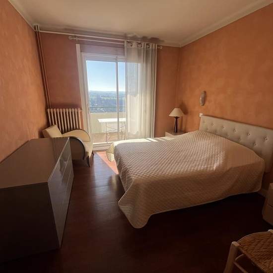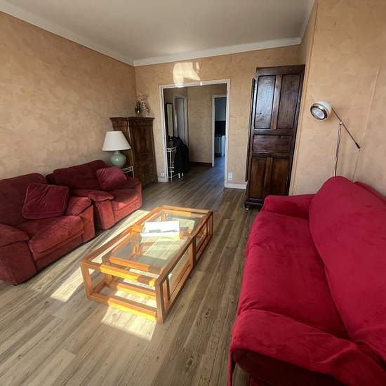 Appartement T3,4e étage comprenant une entrée avec une table console, une chaise, une tablette en verre, un porte manteau, une cuisine avec éléments hauts et bas, une hotte, un frigo top, des plaques induction, un mini lave vaisselle 6 couverts, un four combiné (micro ondes + four grill), une table avec 4 chaises, un balcon avec une table ronde et 2 chaises, un séjour avec une bonnetière, une table basse gigogne, un canapé 3 places et 2 fauteuils, un secrétaire, une tablette en verre avec une lampe, un meuble avec une télévision, un balcon a...