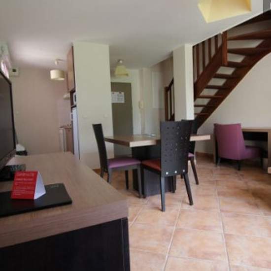 Appartement de 65m² en duplex, au rez de chaussée un salon composé d'un canapé convertible pour 2 personnes, téléviseur avec Canal+, coin repas avec table et 6 chaises, cuisine entièrement équipée (réfrigérateur, plaque vitro, micro-ondes, cafetière, vaisselle fournie et lave-vaisselle), terrasse avec salon de jardin. A l'étage, une chambre avec placard et lit double, une chambre avec placard et 2 lits simples jumelables, 1 salle de bains avec baignoire, WC séparé.