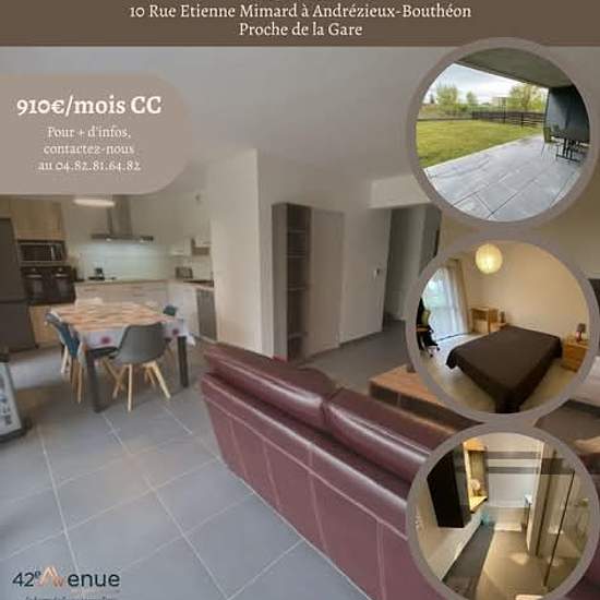 À louer – T5 meublé avec terrasse & jardin – Andrézieux 10 rue Étienne Mimard – Andrézieux-Bouthéon Idéalement situé à proximité immédiate de la gare et des axes autoroutiers, dans un immeuble récent. Découvrez ce T5 meublé d’environ 86,60 m², situé en rez-de-chaussée, offrant un cadre de vie confortable et fonctionnel avec un bel extérieur. Il se compose de : Un hall d’entrée / dégagement Une cuisine ouverte sur séjour Un séjour lumineux donnant accès à une terrasse et un jardin clos Trois chambres 2 salle de bains une avec baigno...