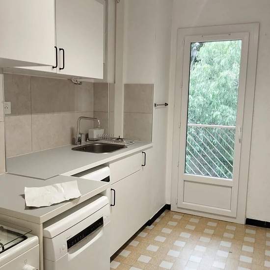 Entrée,séjour donnant sur balcon filant avec vue dégagée sur les jardins de la copropriété, cuisine séparée, aménagée et équipée avec balcon arrière, dégagement desservant deux chambres avec placard, dont une donnant sur le balcon, salle de bains, WC séparé. Appartement rénové, parquet flottant au sol, cuisine aménagée ( gazinière, lave vaisselle, machine à laver, frigo/congèle), chauffage collectif, stationnement dans la rue, ou quelques places collectives. Loué meublé.