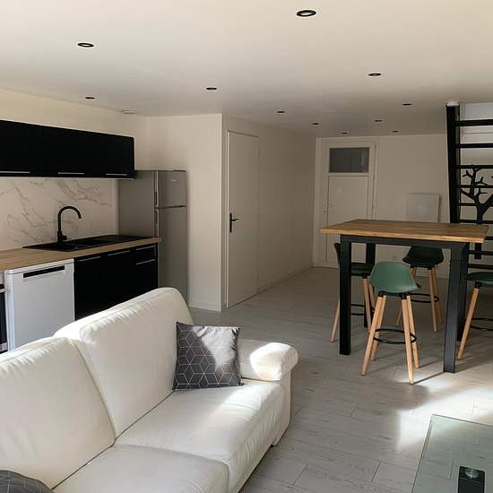 REF 300 - Available immediately! Be charmed by this lovely furnished 63 m² apartment, spread over two levels, combining practicality and character. Access via a shared entrance and landing. First floor: pleasant patio, ideal for a relaxation area or plants, practical storage room. Spacious, bright living area of 32.5 m² with fully equipped open kitchen, utility room with hot water heater. Upstairs: landing, two comfortable bedrooms of 9.9 m² and 12 m², each with built-in closets, a "double" shower room accessible from each bedroom, separate ...