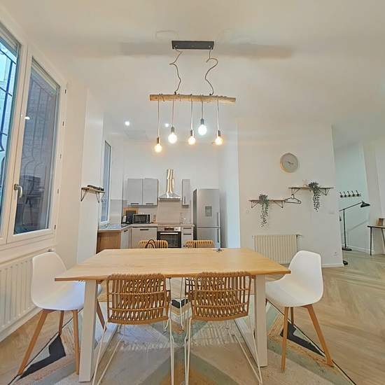 ref LA 6057 F3 MEUBLE en excellent état situé au 1er étage d'une copropriété sécurisée et entretenue 8 rue du Général Foy ST ETIENNE HYPER CENTRE, à proximité de toutes les commodités (commerces, écoles, transports). Hall d'entrée avec rangements, cuisine équipée (four, plaques, hotte, frigo, LV, MO, machine à café) ouverte sur vaste séjour entièrement équipé de façon moderne, deux chambres avec espace rangement, SDB avec douche, double vasque et MAL, wc séparé avec lave-mains, chauff ind gaz, double vitrage PVC, volets roulants électrique, ...