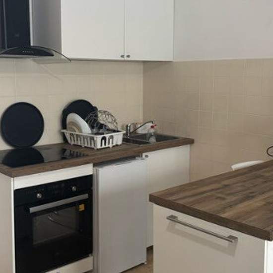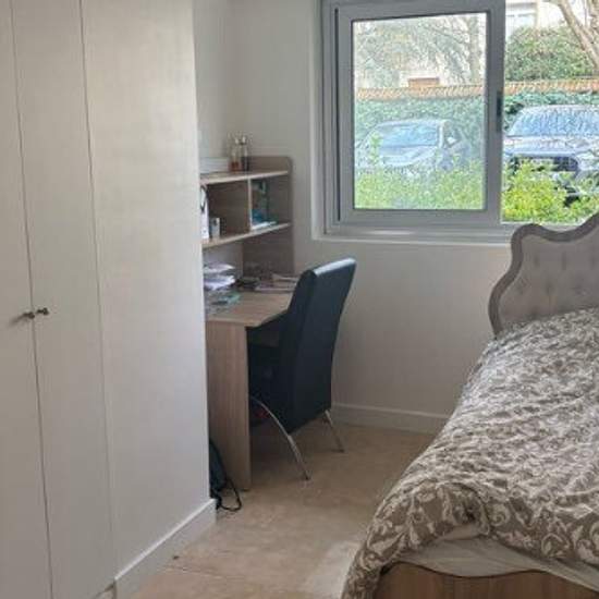 Appartement non meublé à louer : Salle de bain toilettes séparées Hall d'entrée Deux chambres Cuisine intégrée dans le salon Cave 1 place de parking