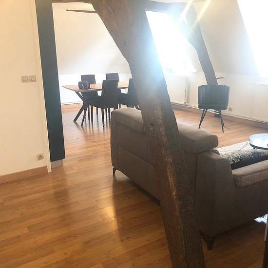 Dans une résidence calme et sécurisée avec jardin communs, ce T3 meublé au 2ème et dernier étage comprend : un hall d'entrée, un grand séjour salle à manger, une cuisine américaine entièrement équipée (plaques, four, hotte, réfrigérateur, partie congélation), un long couloir déservant les 2 chambres, un WC séparé, une salle de bains avec baignoire d'angle. Un garage. Emplacement idéal en hyper centre de Valenciennes, l'appartement donne sur l'église Notre Dame. Très bon secteur. Appartement dans un état impeccable avec parquet, poutres appar...