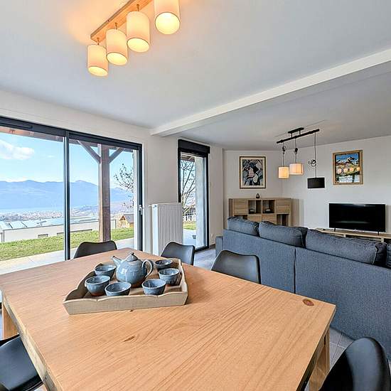 À louer Villa meublée avec vue sur le lac du Bourget Disponible en bail meublé de 3 ans, cette villa entièrement rénovée offre un cadre de vie exceptionnel sur les hauteurs d'Aix-les-Bains, dans un quartier résidentiel calme. Implantée sur un terrain plat de 1 970 m², elle séduit par sa luminosité et ses beaux espaces de vie. Composition du bien : Rez-de-chaussée : Hall d'entrée avec placard, salon-salle à manger lumineux, cuisine ouverte équipée, suite parentale avec salle d'eau, WC indépendant. Étage : Deux grandes chambres avec rangements...