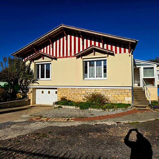 Maison de ville sur sous-sol total comprenant entrée, séjour, cuisine aménagée, deux chambres, salle d'eau, wc. Garage, caves. Terrain clos. Chauffe électrique et complément avec poêle à bois.